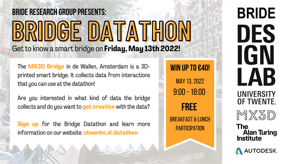 BRIDE (BRIdging Data in the built Environment) is hosting a datathon centered around making data from the MX3D 3d printed bridge meaningful. What "meaningful" means is completely up to you! Expect a day of fun, food, learning, networking, and (possible) prizes! All accepted participants get access to real data generated from sensors on a real bridge and free reign to design, ideate, and code solutions!