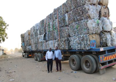 Picture: Tawanda Collins Muzamwese (University of Twente, PhD Candidate standing right) standing in front of a truck with waste bales alongside Mr Tawanda Masuka (Chief Operating Officer of PETRECOZIM after completing Case Study Interviews at a waste recycling networks.
