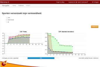 Severe fatigue is a highly prevalent and bothersome symptom for patients with rheumatic diseases. Existing fatigue questionnaires have several disadvantages, for example containing generic fatigue items that might be confounded by disease specific disability, or being unidimensional, which is not in line with the patients´ experience of their fatigue symptoms. Therefore, we developed a multidimensional computerized adaptive test (CAT) which was based on the perspectives of patients with RA. In a CAT, items are successively selected from a large item bank (scaled using IRT), based on the patient’s previous answer. Measurement is thus tailored to the individual level, leading to greater measurement precision, with need of fewer items than traditional questionnaires. We studied the usability of CAT administration, demonstrated the working mechanisms of a computer adaptive test and validated the CAT.