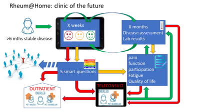 Rheumatic care is usually delivered during regular hospital appointments. The frequency of these contacts is dictated by guidelines rather than the needs of patients. Patients will often achieve low disease activity within one year of intensive treatment, but will retain their regular appointments. The Dutch Society for Rheumatology founded an eHealth working group to study whether this care can be conducted outside hospitals, i.e. at home, supported by eHealth and telemonitoring. To this end the taskforce drew up a framework in which patients in low disease activity or remission no longer need to frequent the participating hospitals, but are periodically questioned with smartphone applications. Because many patients have low literacy and low digital skills, and because patients dislike filling out questionnaires when they are doing well, these assessments will be as generic as possible using a smiley matrix. Only when patients report having health issues does further questioning occur, which may subsequently lead to a teleconsultation, face-to-face appointment or eHealth intervention. The digital infrastructure will utilize existing eHealth applications as much as possible. The present grant application entails setting up the infrastructure, a subsequent study on the cost-effectiveness of this strategy and finally an open extension follow-up of implementation.