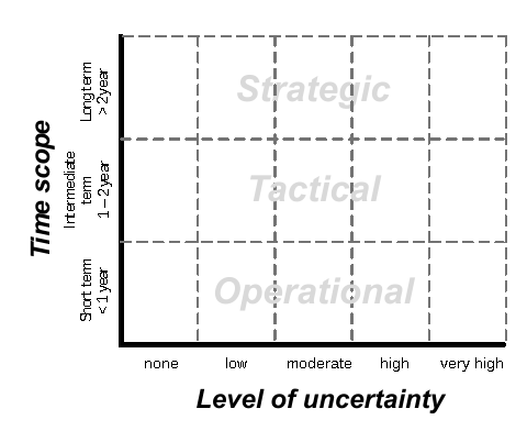 Placing acts and events in timeframes within the future yields valuable information due to the question: ‘what needs to be attended to next?’. A wide known and often (in goal planning) used set of timeframes is the distinction between: short-term [0-1 year; operational level], intermediate term [1-2 year; tactical level] and long-term [2 -5 years; strategic level] (Daft & Marcic, 2009). Subdividing all items within this frame gives a clear overview of when action should be taken, but also provides the decision makers an extra tool to see events in time perspective. When for example a sale loss is predicted over 2 years due to new innovative technologies, perhaps immediate measures may need to be taken to sustain in business.