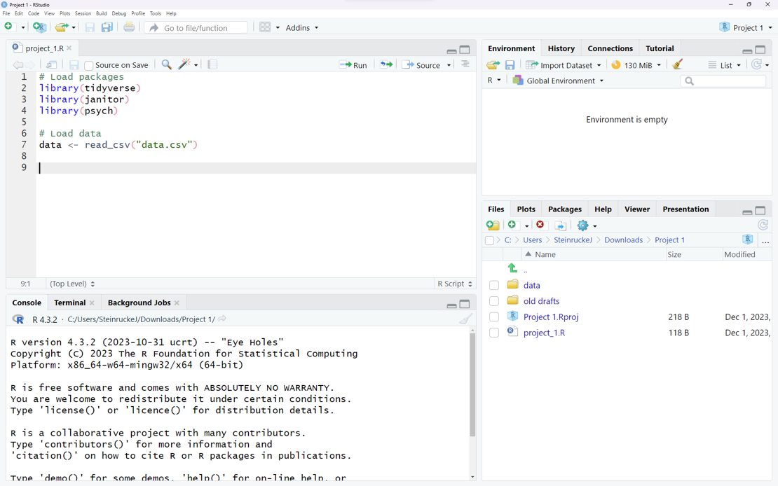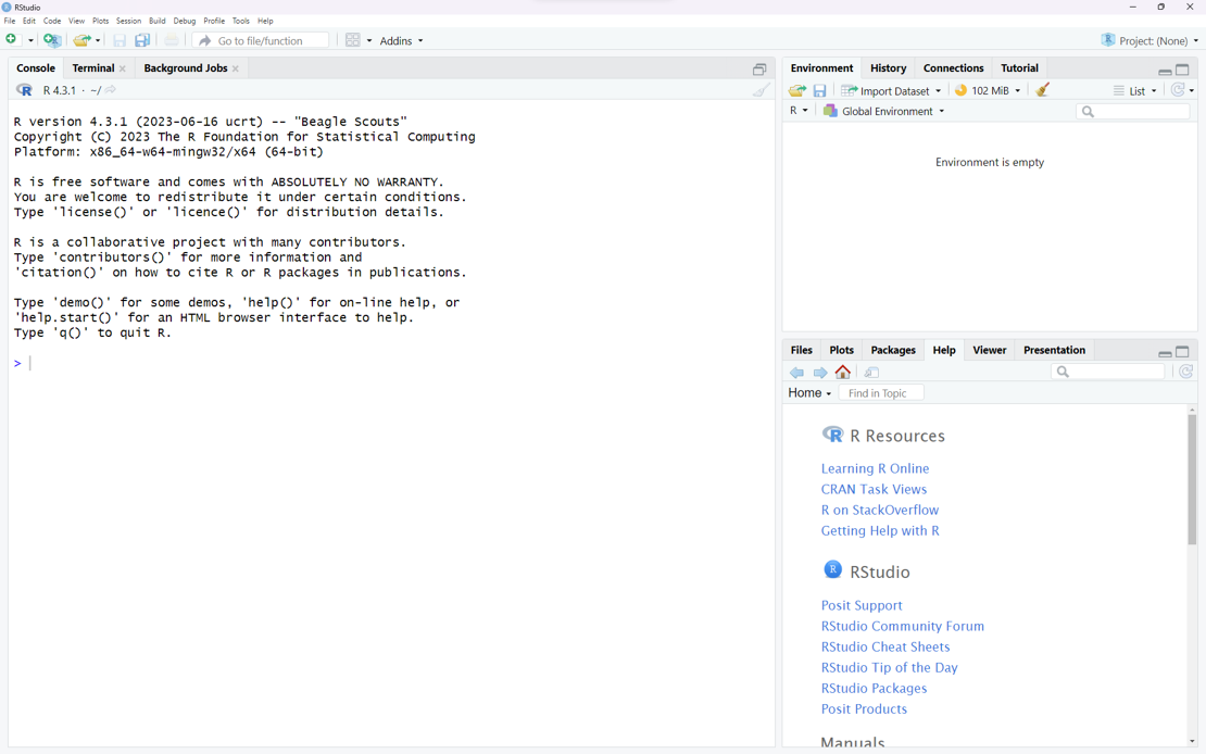 As you can see, in what is labelled the Console RStudio tells me that my currently installed R version is R version 4.3.1. This was the most recent R version at the time of creating this document, so by now there might be a newer one. Please always install the newest R version.
