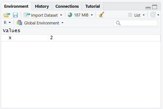 This creates an object x, that has the value 2, which also shows up in your R environment:
