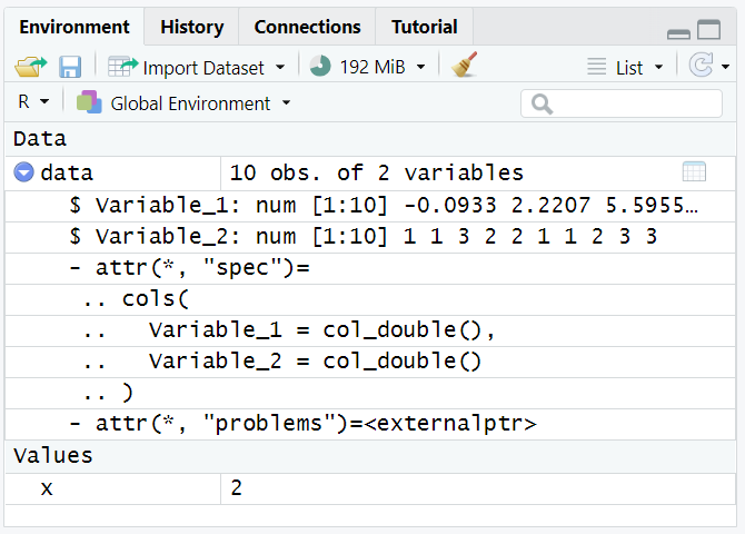 You can also now see the data in your Environment. When you click on the little blue icon, it will look somewhat like this (of course it differs per data set, but what matters is that it shows up in the environment):
