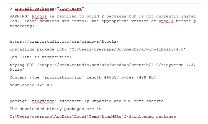 R-Tools is a program that is required to program and make packages yourself. Since you will not be doing that, you should not need R-Tools for any of the things you will be doing. However, sometimes RStudio still gives the message that R-Tools is required when installing a package, even when the installation of the package is going successfully. Therefore, when you try to install a package, your console might look something like this (I will install the library “tidyverse” in this example, but it will look similar with other libraries):