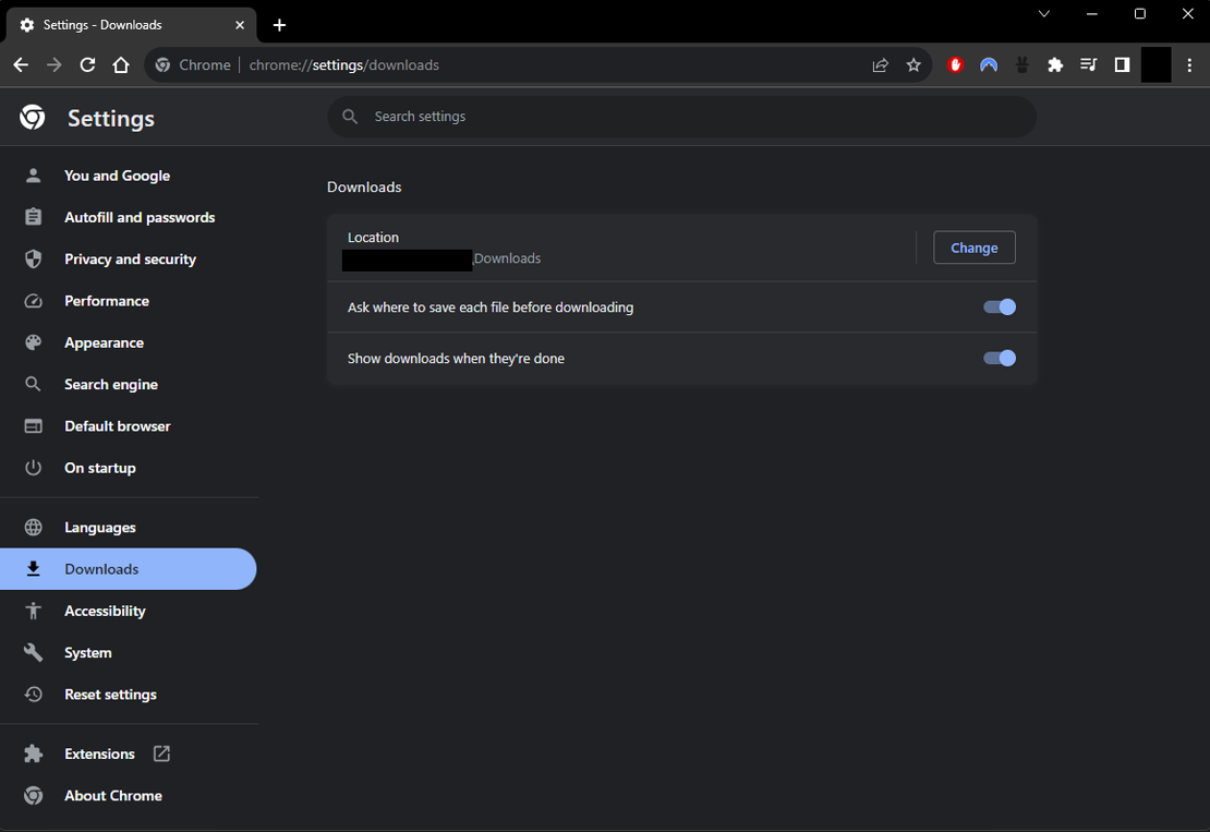NOTE: To choose yourself where something is downloaded to either right-click on the link, and select save link as, or specify in the browser settings that you can choose where something is downloaded to. For example, in Google Chrome go to Settings –> Downloads and enable Ask where to save each file before downloading: