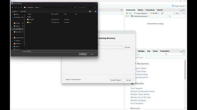 Once you opened the R-project (when creating it RStudio does it for you), you now see in the bottom right pane the (data) files and subfolders that are within your project. All the data that you need for this project, you should put in this project folder or in a subfolder (in the video that subfolder is called “data”).