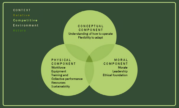 Fighting power describes the operational effectiveness of the Army. It recognises that military forces do not simply consist of people and equipment, but have interconnected an interdepending physical, moral, and conceptual properties as depicted in Figure 1 Fighting power is inherently contextual and it is determined by how well a force (our own, allied, or enemy) can adapt to the character of the operation(s) in which it is engaged.
