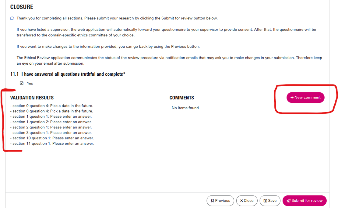 Always save your request and submit for review again (under section 11-Closure). When you press 'submit/resubmit' you will get a validation check, handle accordingly if the validation points you towards issues in your application; the resubmit will be successful if all validation results are resolved. To be sure that the resubmit was successful, you can check if the status has changed to 'waiting for supervisor/reviewer' and that the color of the request in your application overview is blue (instead of red = you have to take action).