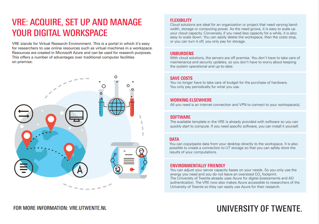 Are you an UT researcher and are you looking for flexible, efficient and scalable computing infrastructure to perform simulations / calculations? Do you want to use a starting budget? Then use the Virtual Research Environment (VRE) en read the text below.