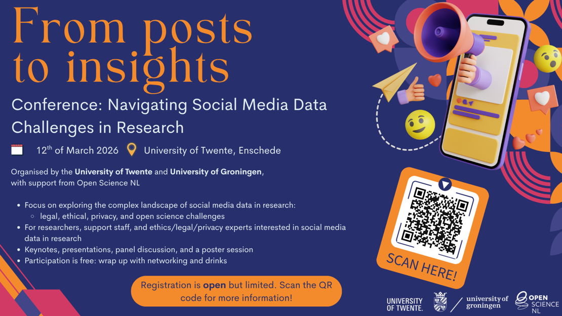 The University of Twente and the University of Groningen, with support from Open Science NL, are proud to host a one-day networking conference focused on the opportunities and challenges of using social media data in research.