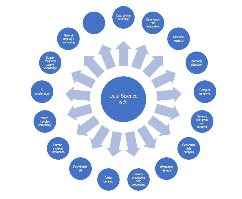 The DS&AI domain encompasses many fields of research including, but not limited to (complex) networks, anomaly detection, sensory data processing and interpretation, data fusion and integration, geospatial data analysis, data-driven modeling, information retrieval, machine learning, privacy preserving data processing, social sensing, explainable AI, human-systems interaction, neuromorphic computing, AI hardware accelerators, spatiotemporal scene understanding and natural language processing. Other subfields easily come to mind.