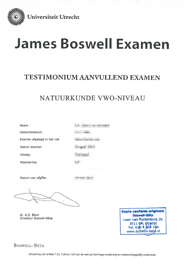 As of December 2024, James Boswell-Bèta will issue digital certificates only, which the University of Twente can verify online. Certified photocopies will no longer be required once you have received the digital version. However, if you hold an earlier, non-digital certificate, you must still provide a certified photocopy for enrolment.