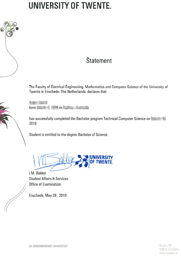 Below is an example of the University of Twente graduation statement. The layout of the document may vary depending on the layout of your institution.