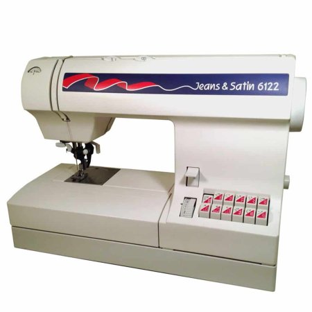 A fully stocked sewing kit with threads, bobbins, scissors (for thread and fabrics only), measuring tape, seam ripper, needle threader, hand sewing needles, thimble, and various presser feet.