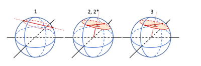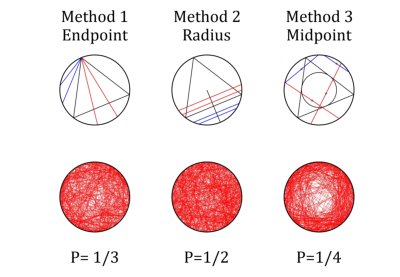 Three methods, three outcomes in Bertrand's paradox. Draw a random line from one point on the circle to another (1), choose a random radius and angle and draw a line perpendicular to it (2), or choose a random point inside the circle and consider this as the midpoint of a line (3). Only the second method gives a uniform density. Below: from 2D to 3D.