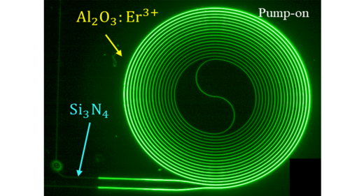 Erbium is often used in fiber optical amplifiers (EDFA’s), but this mostly results in bulky components. Thanks to the correct combination of material, erbium concentration and waveguide architecture, the amplifier can be made very small, while providing high optical gain. A major question is: how do you connect the amplifier with the rest of the photonic circuit? This is achieved by using a double photonic layer coupler technology developed in Garcia-Blanco’s group. A special ‘tapering’ design permits transferring the light back and forth between the passive silicon nitride photonic circuit and the amplifier section, with negligible loss. In this way, the amplifier section becomes a building block that can be introduced by chip designers into any photonic chip that requires amplification. It resembles the way electronic building blocks can be simply introduced on every part of an electronic chip.