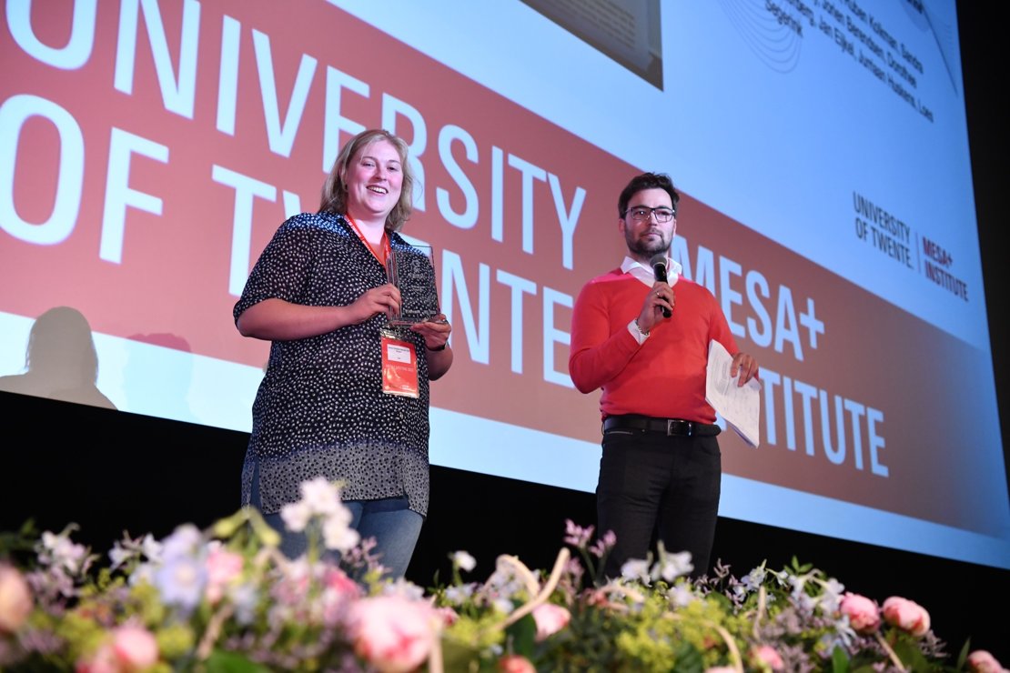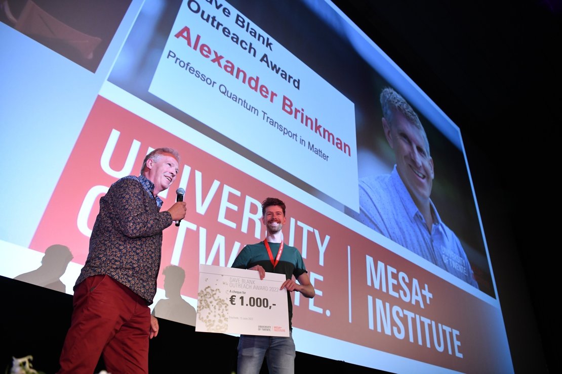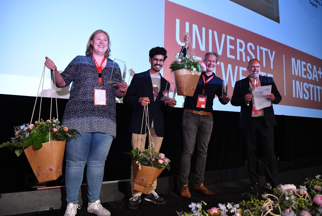 This year’s Dave Blank Outreach Award, consisting of €1.000 to be spent on outreach activities, was given to Alexander Brinkman, professor of Quantum Transport in Matter. The Business Impact Award was awarded to Nienke van Dongen, Ruben Kolkman, Sandra Michel-Souzy, Jorien Berendsen, Dorothee Wassenberg, Jan Eijkel, Jurriaan Huskens and Loes Segerink, with their poster ‘Cancer biomarker detection on chip in urine samples’.
