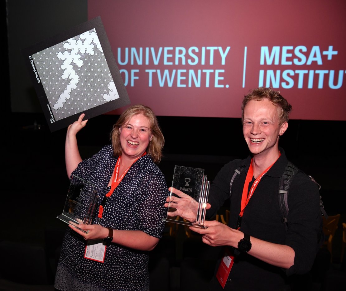 The prize for the MESA+ Photo contest, the first quarter’s picture award, was also awarded at the MESA+ meeting. Nienke van Dongen claimed it for her picture of air cleaning droplets.