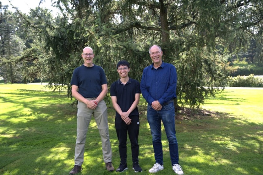 Natthajuks Pholsen (short name “Besto”) with Profs. Willem Vos and Klaus Boller in the campus park landscape of the university. The photo was taken in bright sunlight between two heavy rain showers.