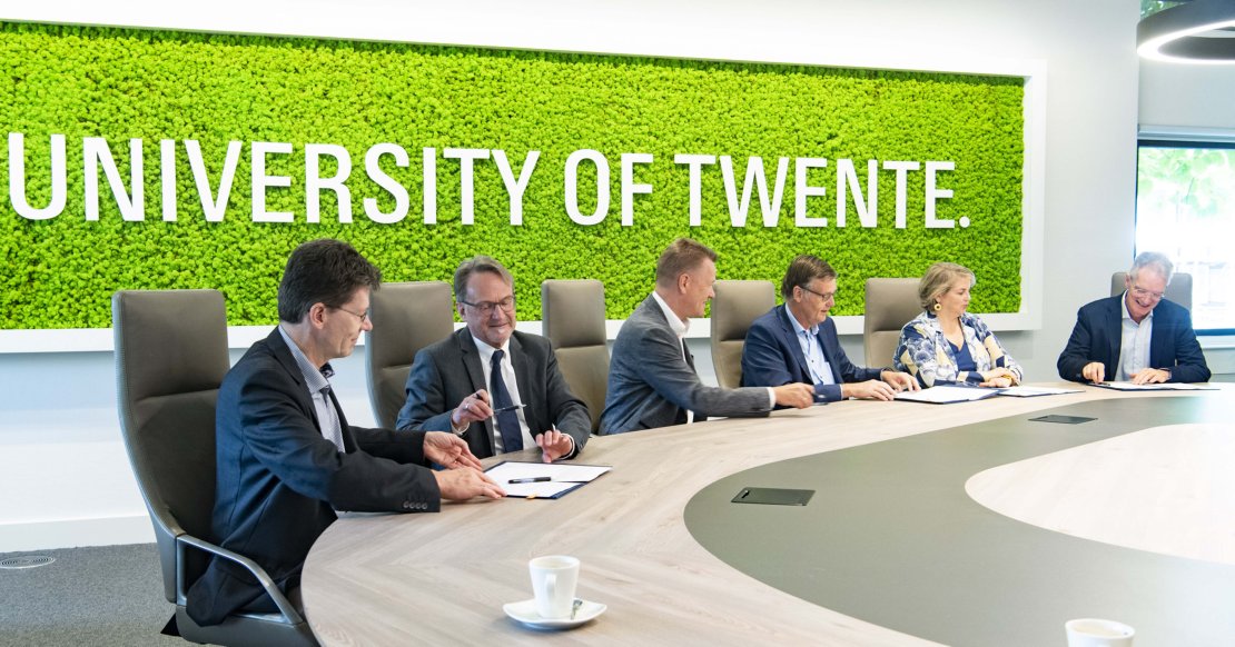 The agreement is signed by (left to right) Professor Michael Rohlfing, (Physics, WWU), Professor Joachim Jose (Chemistry and Pharmay, WWU),  Professor Johannes Wessels (Rektor, WWU), Professor Tom Veldkamp (Rector Magnificus, UT), Professor Jennifer Herek (Science and Technology, UT) and Professor Joost Kok (Electrical Engineering, Mathematics and Computer Science UT)
