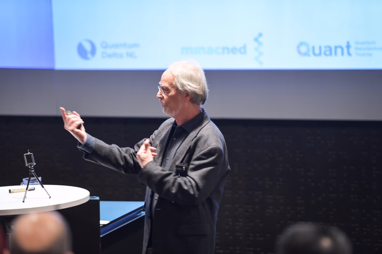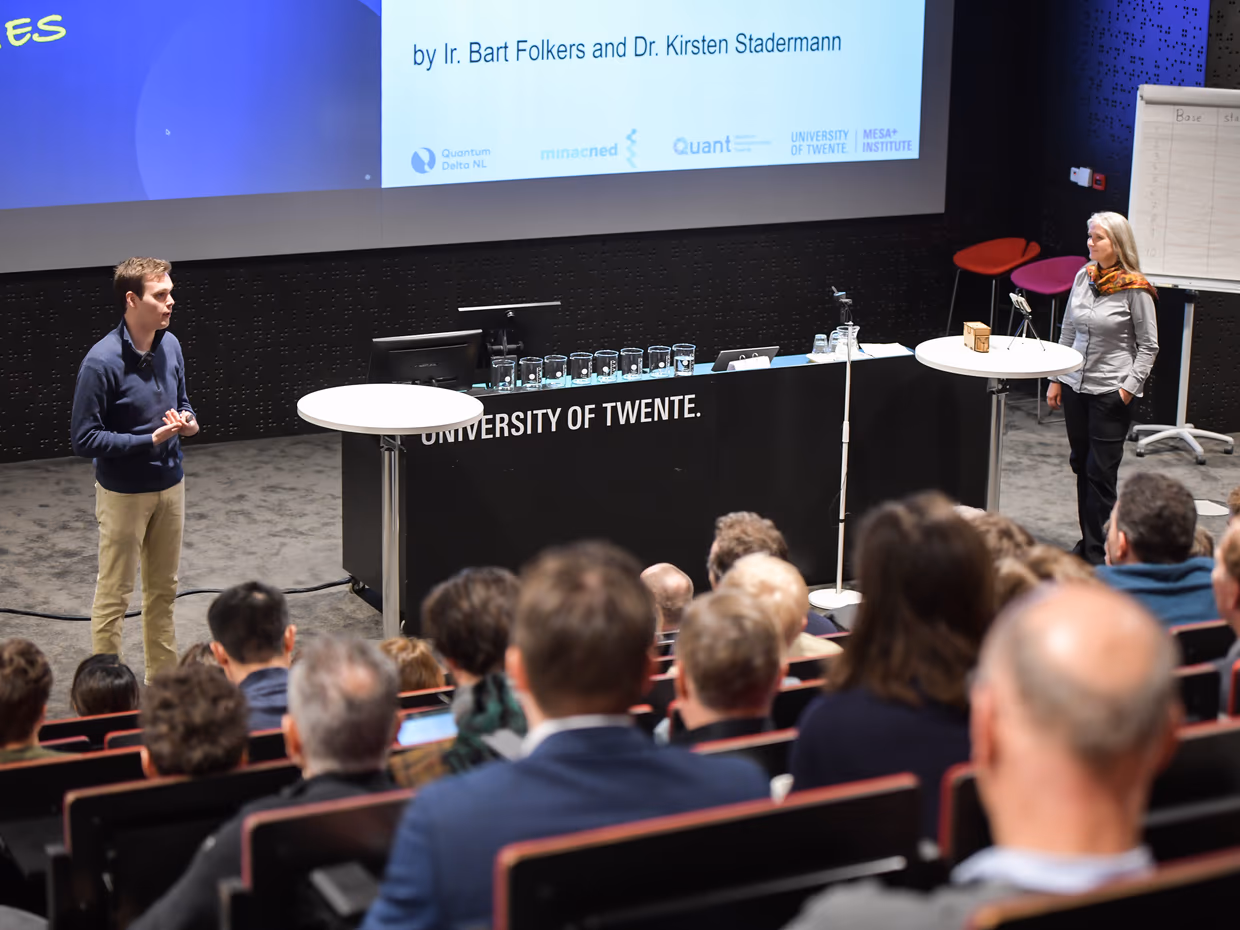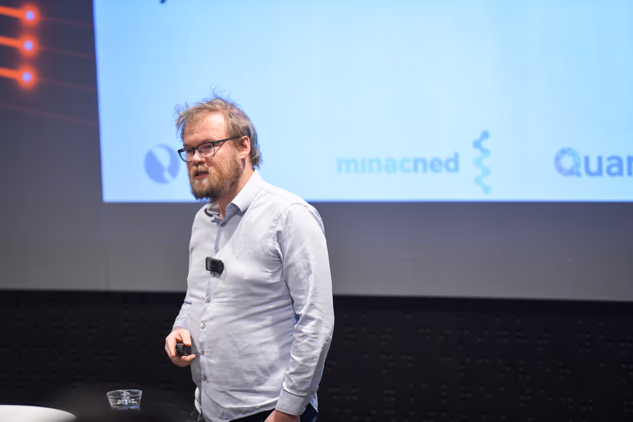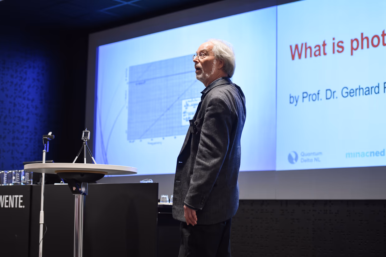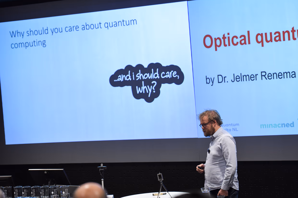 Using various examples, Jelmer clarified how much knowledge and expertise the Netherlands has in Quantum technology and how important this position is for Europe, including Twente’s expertise in Quantum Computing in particular. Jelmer concluded his presentation with the beautiful words that it all started in Twente with Pepijn Pinkse. Someone who did ‘something’ with quantum, but the ‘something’ that Pepijn once started with has now been rolled out to a position where Twente is conquering Europe with quantum computing.