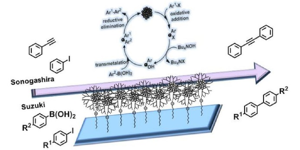 A very positive surprise Roberto experienced during the second half of his thesis work. This part deals with the use of dendrimer-encapsulated metallic nanoparticles, covalently attached to the inner surface of a microreactor. Dendrimers-encapsulated palladium nanoparticles imparted high catalytic activity in a very stable way. The dendrimer template stabilized the palladium nanoparticles over seven days of consecutive use with minimal leaching.