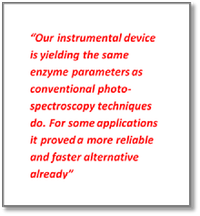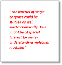 ‘The principles taking place might also be of great interest in detecting short DNA oligomers,’ Jin says. ‘The kinetics of single enzymes could be studied as well electrochemically. This might be of special interest for better understanding molecular machines. Our instrumental device is yielding the same enzyme parameters as conventional photo-spectroscopy techniques do. For some applications it proved a more reliable and faster alternative already.’