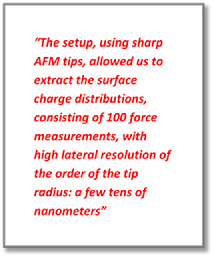 ‘As a result we were able to look into our samples in considerable detail,’ Naveen says. ‘The setup, using sharp AFM tips, allowed us to extract the surface charge distributions, consisting of 100 force measurements, with high lateral resolution of the order of the tip radius: a few tens of nanometers. These findings were a major step towards the nice end results that we were able to present.’