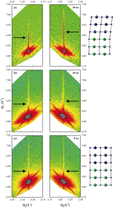 X-ray diffraction measurements have shown that films of different thickness have significantly different crystalline structures. The thickest film (8 nm) is at the top, while the films in the middle and at the bottom are 4.0 nm thick and 3.6 nm thick, respectively. The crystalline structure of the thickest film is slightly "tilted" relative to the substrate.
