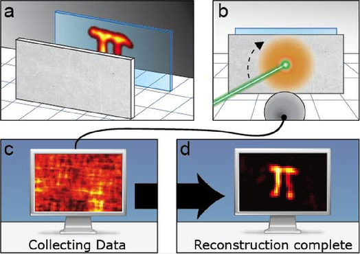 Looking through an opaque material (a)The test object used was the Greek letter “π“, written in fluorescent ink and 100x smaller than the one printed here. The test object was covered by a strongly scattering ground-glass diffuser that completely hid it from view. (b)A laser beam was then scanned in angle, always hitting the diffuser in the same spot. The test object only yielded a diffuse glow of fluorescent light. (c)The intensity of this fluorescence was measured versus the angle of the laser beam and recorded by a computer. The seemingly random pattern bears no resemblance to the test object. (d)The computer then searched for similarities in the measured pattern which are used to calculate the true shape of the test object. |