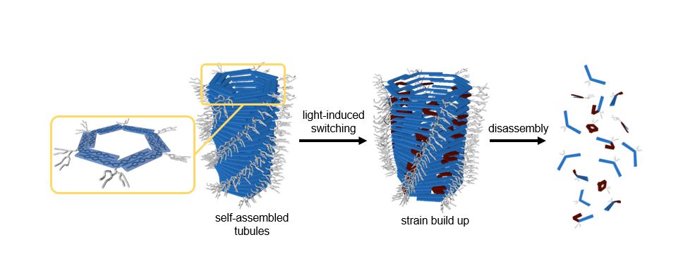 Because of their extremely small scale, and the fact that most artificial molecular machines can only function when suspended in a liquid, it is generally impossible to harvest the force they can exert as they operate in a ‘stormy’ environment with the omnipresent (ubiquitous) Brownian motion (random motion of particles suspended in a fluid). Nevertheless, making these forces measurable is exactly what is needed to put them to use. Tibor Kudernac, University of Twente researcher and former colleague of Ben Feringa, therefore set himself the goal of developing synthetic molecular machines whose power could be measured and set to use. To achieve this, he directed himself towards supramolecular chemistry, and self-assembly in particular. Kudernac and his co-researchers have developed chemical building blocks that naturally clustertogether to form tubules, tube-like structures up to a  micrometre long and few nanometres wide. When these tubules are illuminated with light, mechanical strain accumulate in their structure until a threshold value is exceeded and the structure abruptly falls apart, releasing the energy. In this way, the researchers succeeded in converting light energy into a stored strain energy that subsequently fuels the specific mechanical response.