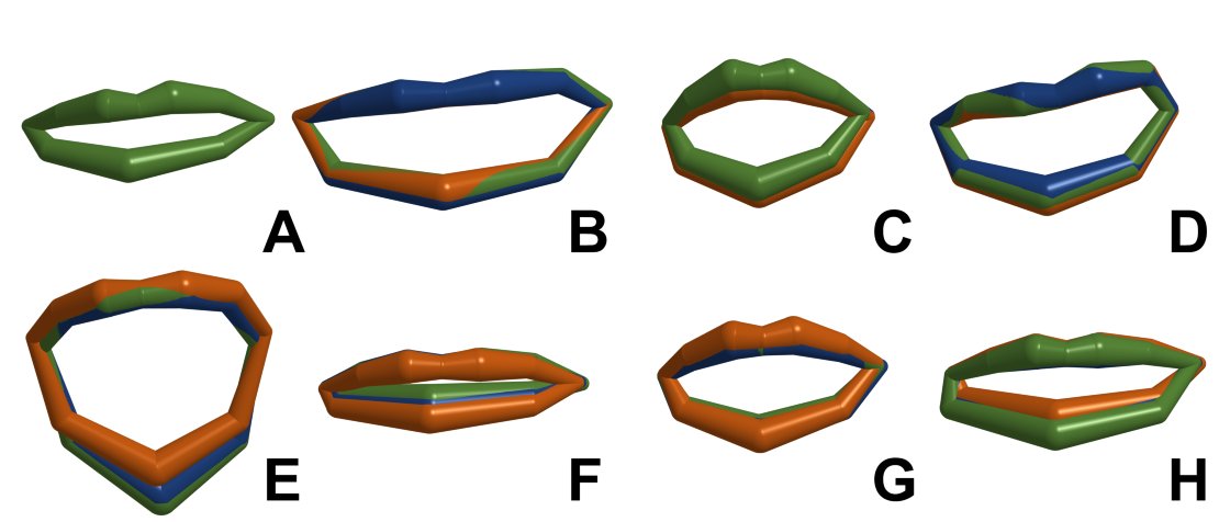 Measured 3D shape of the lips for various facial expressions, in green. The blue and orange 3D lip shapes were predicted using two different statistical models based on muscle activation signals using EMG. A. rest B. voluntary smile, C pursed lips, E mouth open, F depressed mouth corners, G blowing H pouting.