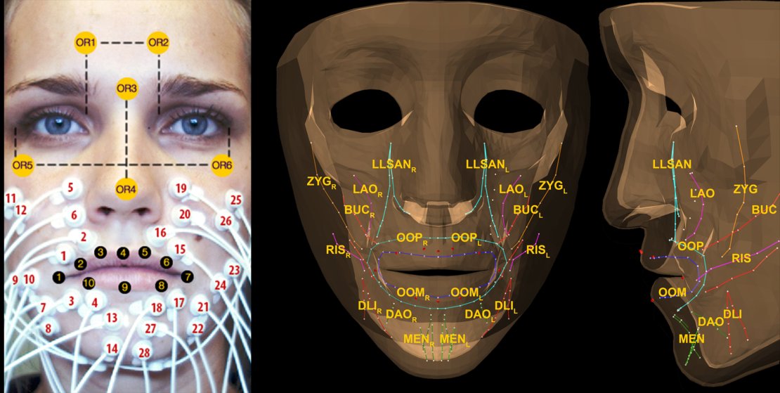 A test subject wearing 16 EMG electrodes for measuring muscle activities and lip markers to capture the movements using a 3D camera. On the right: the biomechanical model in ‘ArtiSynth’ (www.artisynth.org) used by Eskes. The abbreviations of the muscle names: ZYG, zygomaticus major, RIS, risorius, LLSAN levator labii superioris aleque nasi, LAO levator anguli oris, BUC buccinators, OOP Orbicularis oris peripheralis, OOM, marginalis, DLI depressor labii inferior DAO depressor anguli oris and MEN mentalis