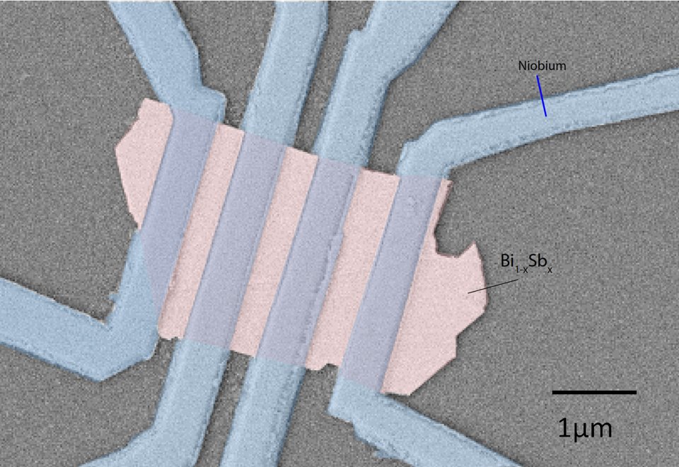 By applying superconducting electrodes, made of niobium, to a thin crystal flake of bismuth doped with antimony, a superconducting current flows through the material at a temperature of 10 milli Kelvin. In a superconductor, paired electrons, so-called Cooper pairs, are responsible for conduction. This is not the mechanism inside the bismuth: here, Majorana particles are responsible.