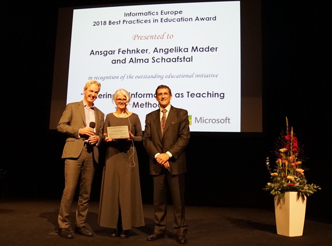 Angelika Mader, Ansgar Fehnker and Alma Schaafstal received the “Best Practices Award” from Informatics Europe, for their work on “Tinkering in Informatics as Teaching Method”. Congratulations to our colleagues for this distinction which is at the same time a very nice recognition of the work done within the CreaTe program.
