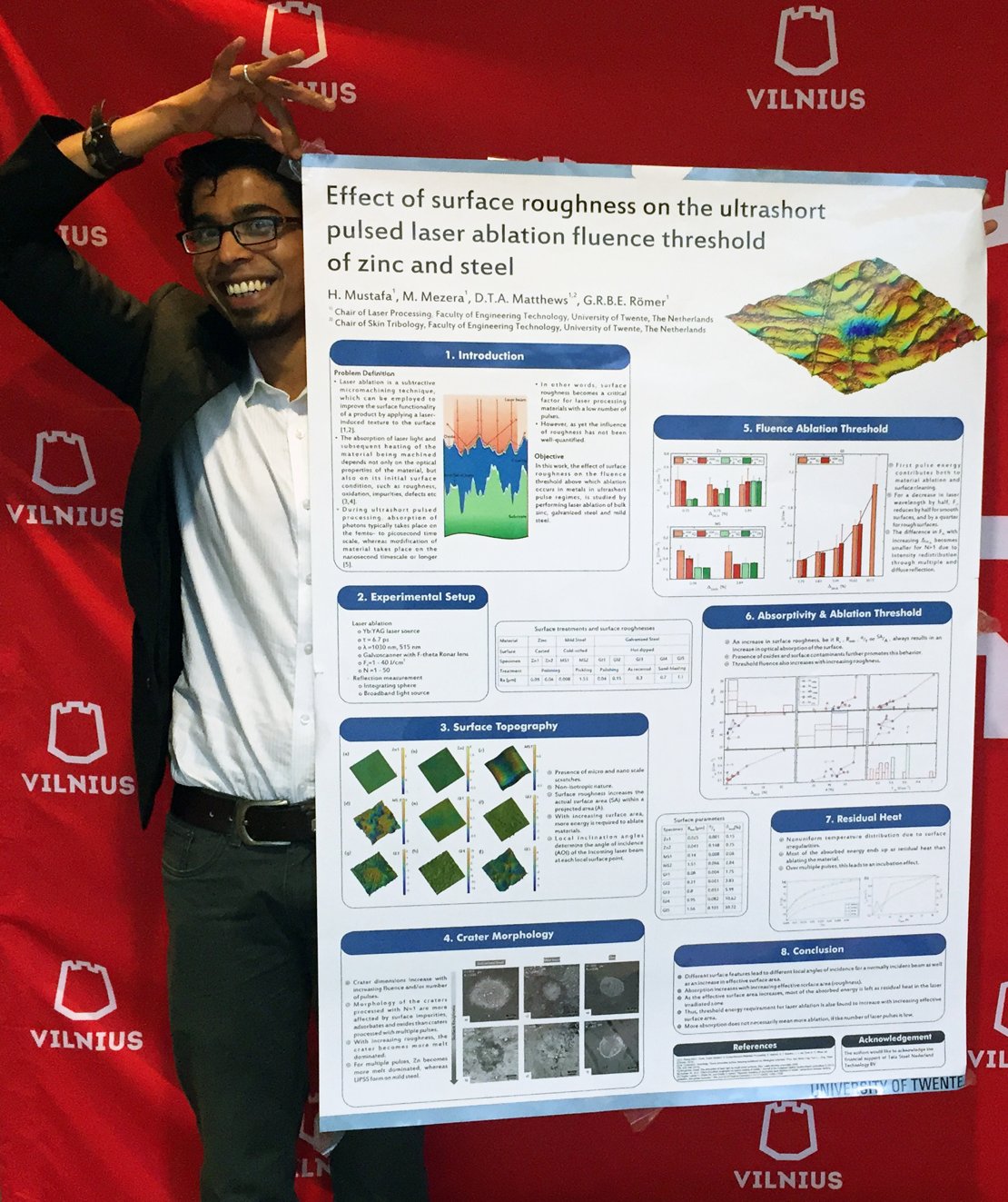 The presented work of Hasib Mustafa discussed the effect of surface roughness on the laser ablation threshold of zinc, forming steel and galvanized steel. Hasib: “We found that within the boundaries of our experimental (laser) conditions, the ablation threshold increases with increasing surface roughness. It is counter-intuitive to the fact that light absorption increases with increasing surface roughness.”