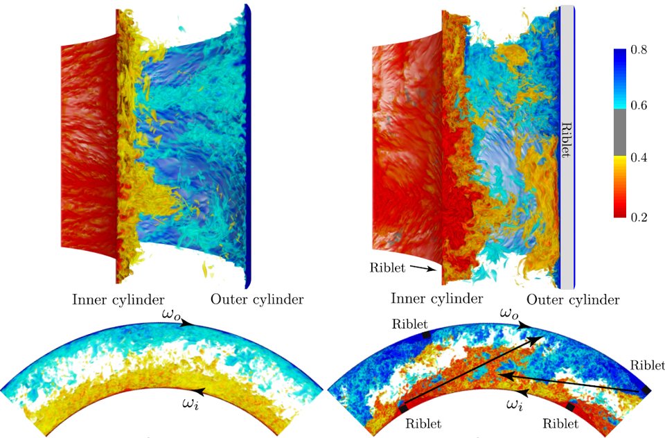 Turbulent flow between two rotating cylinders (Taylor-Couette), on the left the side and top views of the situation without surface roughness, on the right riblets introduce surface roughness. This causes a major change, not only at the surface of the rotating walls, but in the flow pattern as a whole.