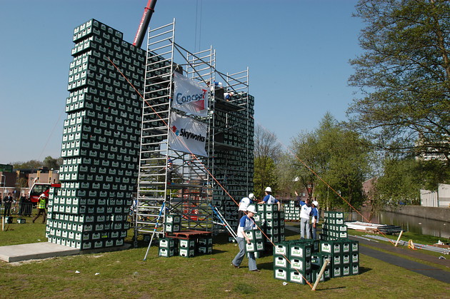 Currently, the students are in preparation to make sure the attempt that will be held in the week of 12 November will be an success. Inofficial rules say the bridge need to be able to stand on its own for at least one hour, without any means of help like glue, duct tape or straps. This will be a major challenge, says ing. G.H. Snellink, who is a lecturer in Civil Engineering at the University of Twente. He is one of the advisors of the team. "There is no way that you can fix these crates together, which requires the help of pressure to build a solid construction." The current design is based on an arch bridge design of over 8,000 beer crates. If these were piled up, it would lead to a tower of 1,900 meters hgih, roughly six times the Eiffel Tower.