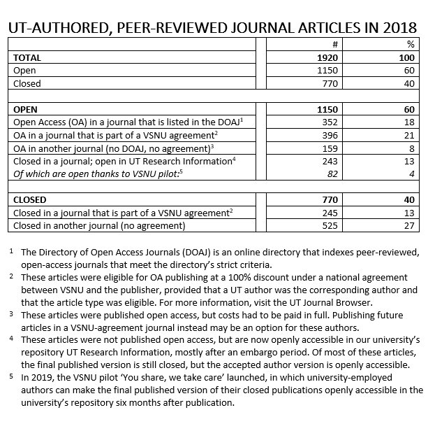 Each year, all Dutch universities calculate their open-access percentage: How many of their university-authored articles that were published in the previous year are openly accessible? The Association of Universities in the Netherlands (VSNU) collects these percentages and informs the Ministry of Education, Science, and Culture about the universities’ progress towards 100% Open Access. The percentages are broken down into categories: