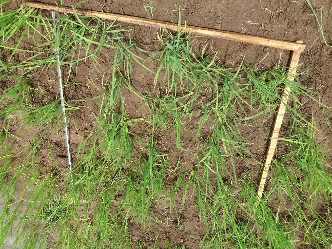 To make AccuPAR readings, sample field preparations were necessary such as to flag ten 1m2 quadrant, remove non-targeted plants, and avoid grazed areas, edge of the plot and areas directly adjacent to past sampling. Ten below and above canopy sample readings were taken and the average of these recorded as the quadrants value. To get a reliable measurement by the AccuPAR, it is also important to properly place the ceptometer between the rows to get representative values (Figure 2). Leveling the light bar and external sensor, re-calibrating the light bar when sky conditions frequently change, placing the instrument completely bellow the canopy are some of the important considerations to get accurate results. The readings were saved for every quadrant in a code that matches the GPS reading, unique for the crop types and location. Until preparing this news item, we have been able to collect 100 observations.