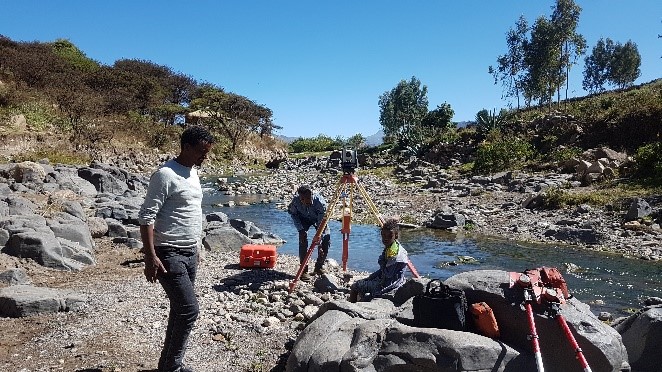 One of the main research component of EENSAT project at Zamra is surface water; modeling surface runoff magnitude and its interaction with groundwater. Accordingly, two stream gauging stations are established at Zamra (Figure 6a). The two gauging sites are established in close collaboration with Tigray Bureau of Water Resource and local administrations. Both the sensors are Keller DCX-22 Level Logger type and the sensors are buried below the stream bed with metallic protection caps. Topographic survey was conducted using total station to establish the cross sectional and longitudinal profile at the gauging site (Figure 6b) .