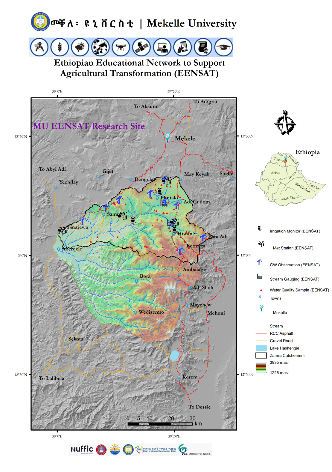 One of the research sites of the EENSAT project is Zamra catchment (Figure 1). It is one of the most upstream contributing catchment to Tekeze River Basin. All three PhD students from Mekelle University carry out their research activity at Zamra catchment. As part of the Research component, EENSAT has installed several field equipment at Zamra Catchment including weather station, groundwater observation, irrigation scheme observation, stream gauging, and water quality observation. Local partners including Tigray Bureau of Water Resource, Tigray Meteorological Agency, Tigray Bureau of Agriculture and Rural Development and local administration are consulted prior to field equipment installation to ensure their sustainability.