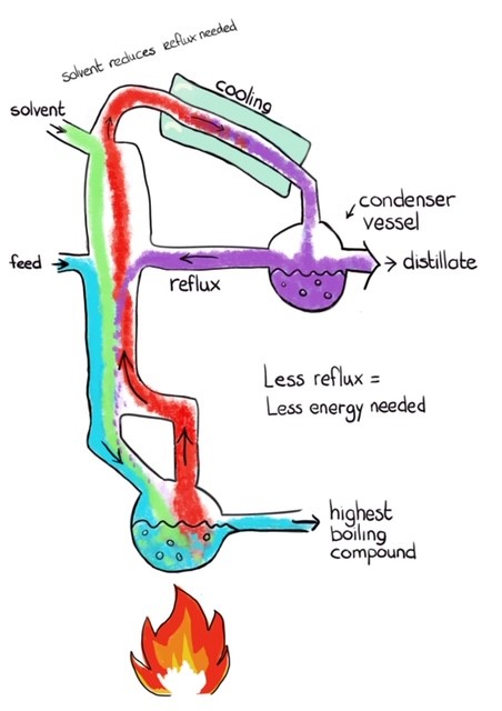 This is because much less distillate needs to be fed back into the distillation column with Cyrene™ as the solvent. Distillation involves evaporating a liquid and collecting and cooling the resulting vapour. Some of the condensed vapour has to be fed back in the form of liquid, known as ‘reflux’.