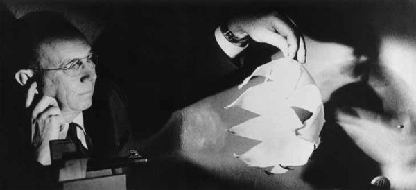 Above: selfportrait of Howard 'Doc' Edgerton (1959) with balloon and bullet. Below, in the same pose, David Fernandez Rivas (2021) with droplet and jet: too small and fast to capture with his smartphone.