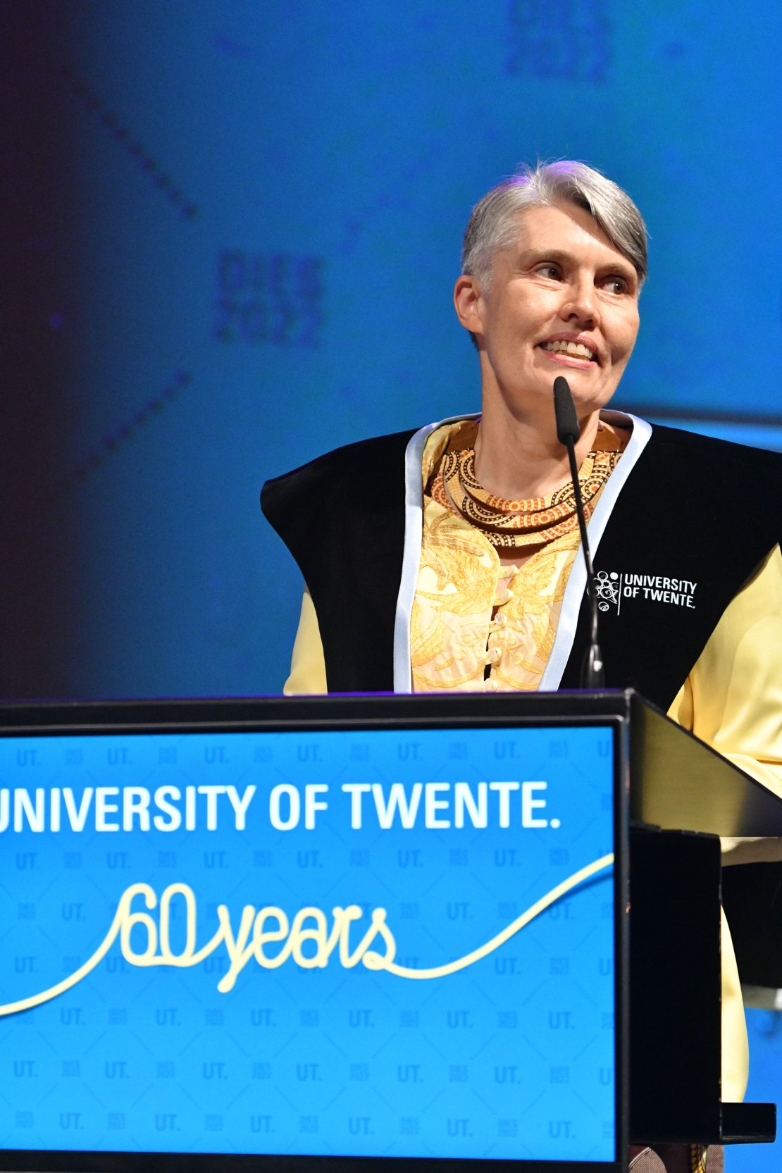 Last November, the coronavirus impeded a festive celebration of the 60th anniversary of the University of Twente. The celebration was therefore postponed until today. The patient visitors were not disappointed and were treated to a festive 60th edition of the Dies Natalis. A special highlight was the presentation of the Enschede Medal by Mayor Roelof Bleker from the Municipality of Enschede to the University.