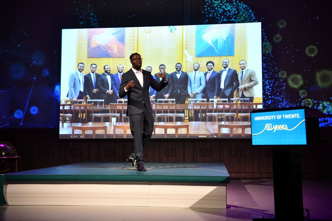 Some seven hundred visitors filed into the main hall of the Waaier for the festive ceremony and at least as many joined in digitally to watch the live stream. Traditional elements such as the Gaudeamus Igitur sung by the men of Cnodde, the cortège and the presentation of the honorary doctorates were present. But the celebration also had a hip and modern twist with, among other things, the music of singing twins Arnout and Sander Brinks - stage name Tangarine - and inspiring pitches from young UT scientists. UT researchers Femi Ojambati (ST faculty), Jerre Starink (EEMCS faculty) and Funda Atun (ITC faculty) shared personal stories about the connection between their passion, their lives and their work.