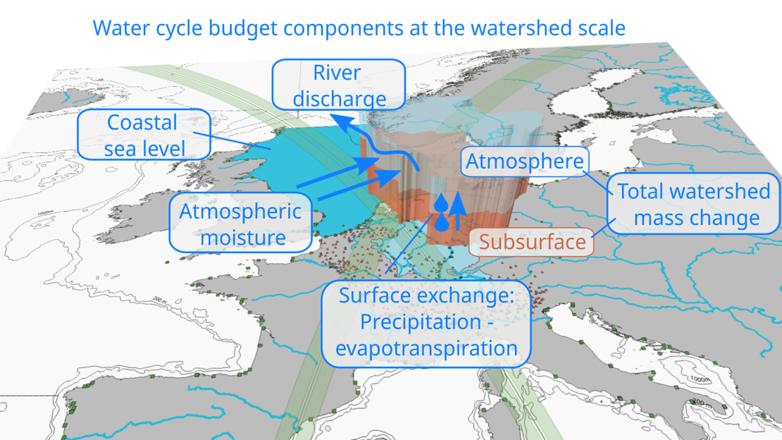 For example, the change of water volume in the Rhine catchment is influenced by the balance between water vapour input via the atmosphere and output via rivers. Precipitation, evaporation and transpiration of plants cause an exchange at the interface between land and atmosphere.