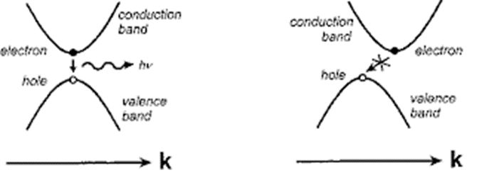 Energy levels, bands, at which an electron can exist. The conduction band is responsible for conducting electric current. Inbetween the conduction band and the valence band, there are forbidden energy levels - the so-called band gap. An electron may cross this bandgap, releasing a photon, in the case of the direct band gap (left). In the situation on the right, the electron can't simply cross because of the indirect band gap.
