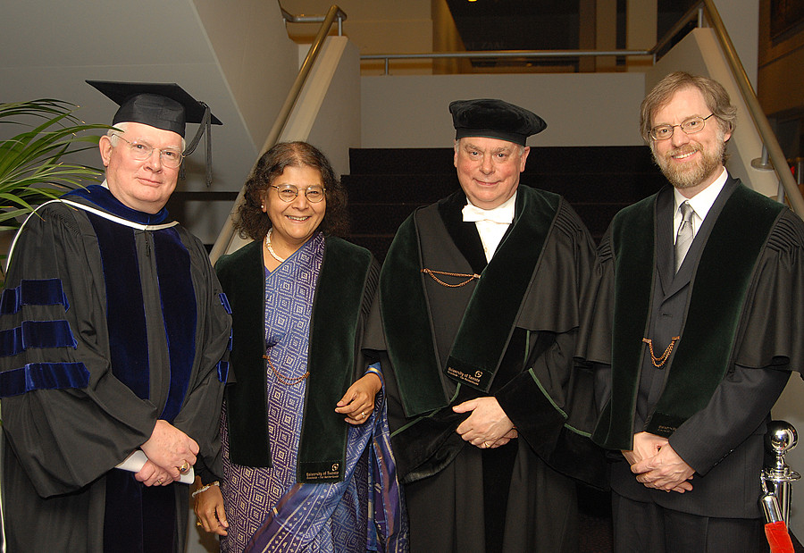 Honorary Doctorate Ceremony in 2006. From left to right: John Mauger (he replaced Sung Wan Kim who was ill), Sheila Jasanoff, Fraser Stoddart and Gerard Holzmann.